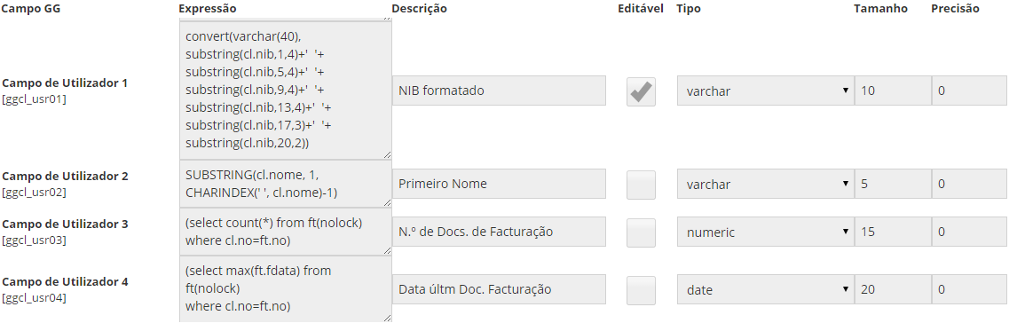 •Expressão - Expressão SQL que define o valor do campo. Ao preencher o campo Expressão, após guardar, o Campo de Utilizador passa a estar Ativo.
