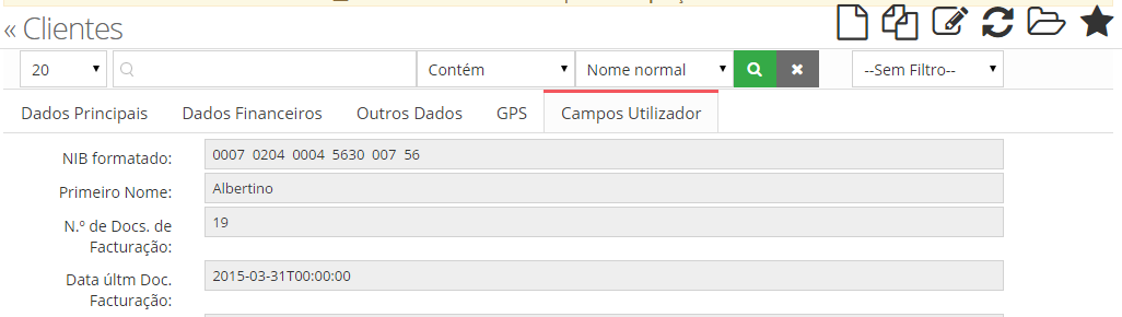 Após definir os Campos de Utilizador, os mesmos passam a estar disponíveis na vista de detalhe da Entidade, através do separador "Campos Utilizador".